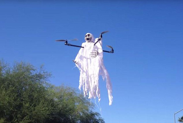 今年万圣节前夕,美国亚利桑那州一男子突发奇想制作了无人机幽灵,并将自己 “无人机幽灵”的视频发布在You Tube上,引发众多网友追捧。作为一名无人机爱好者,创意十足的他将将一架无人机安插在盖有白布的幽灵骨架上,这样幽灵就能“飞行”到处吓人,恐怖效果满分。