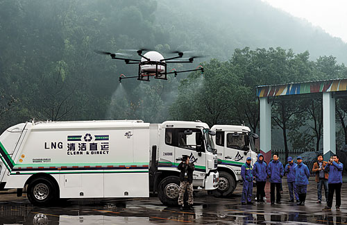 昨天上午,杭州市环境集团为改善杭城空气质量,护航G20国际峰会,在天子岭循环经济产业园区,亮出了可以实施“精准打击”的无人机和LNG新能源清洁直运车。