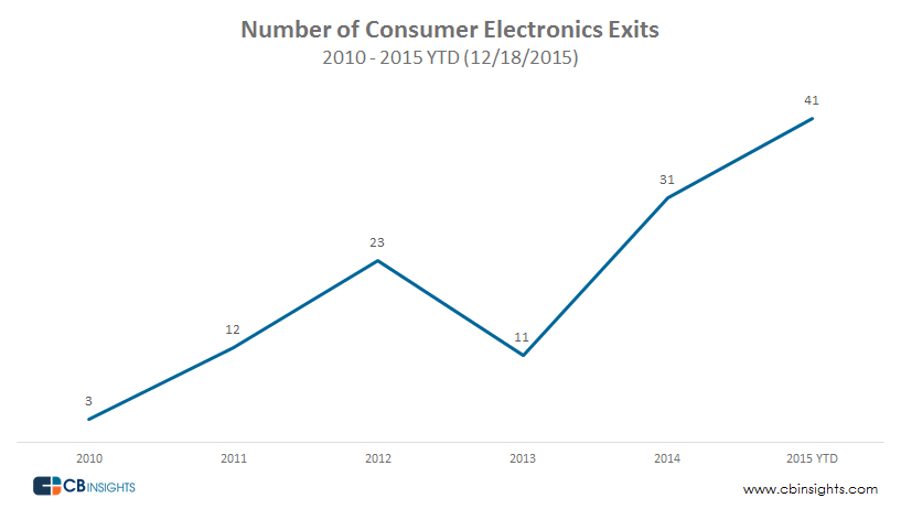 退出的数字也一直在上升,2015年 退出的公司高达 41 家,超过了以前 5年 中的任何一年。 Fitbit 是该领域最大的退出者。该公司在 2015年 的 IPO 中估值 41 亿美元。 GoPro 原本保持着估值的第一名,在 2014年 的 IPO 中估值 31 亿美元(虽然股价自那时开始已经在公开市场下跌)。该领域没有太多大型公司的退出,自 2010年 以来,1 亿美元+的退出公司只有 30 家。然而随着可穿戴设备和物联网产品越来越受到欢迎,我们会在未来看到更多的退出发生。