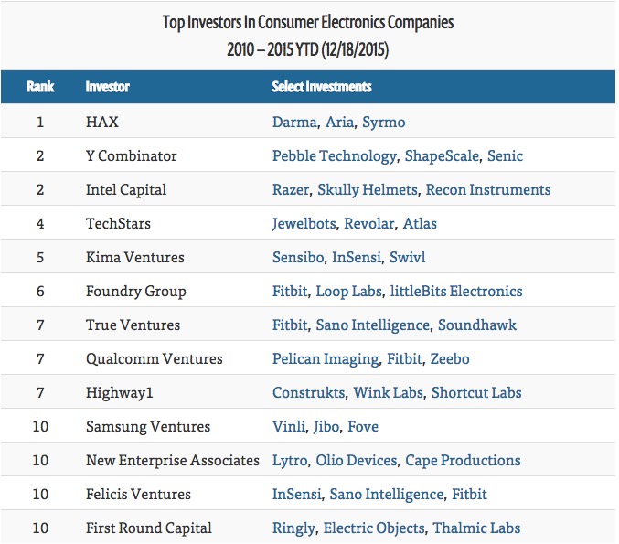 消费电子公司最活跃的投资者目前是硬件创业孵化器 HAX,自 2010年 以来,HAX 已经投资了超过 45 家公司。列表中其他几个著名的孵化器包括 Y Combinator 和 TechStars,以及专注硬件的加速器 Highway1。