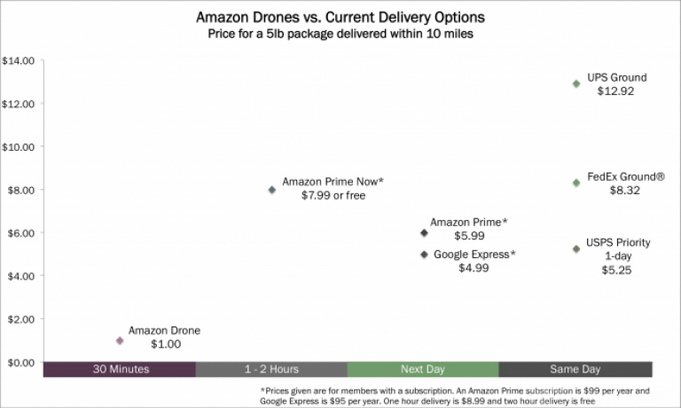Tasha Keeney在ARK Invest的一份报告中称亚马逊的Prime Air无人机快递服务在运送每趟快递时所需的成本为88美分,倘若亚马逊对他的客户收取每笔快递1美元的快递费,那么亚马逊就能赚回投入成本的近50%,这比现有的快递方式成本要廉价得多。