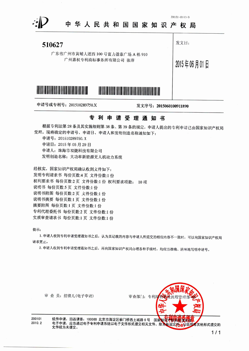 珠海双捷科技的大功率无人机动力系统主要针对由电池驱动的大中型实用型无人机飞行器而设计,其优点在于:
