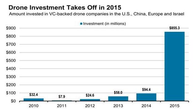 据Dow Jones VentureWire的数据,2015年,美国、中国、欧洲和以色列的风投在无人机初创公司方面的投资金额打破多年来的记录。截止到12月22日,美国、中国、欧洲和以色列的无人机初创公司累计融资金额为8.553亿美元,而2014年的融资金额仅为9440万美元。