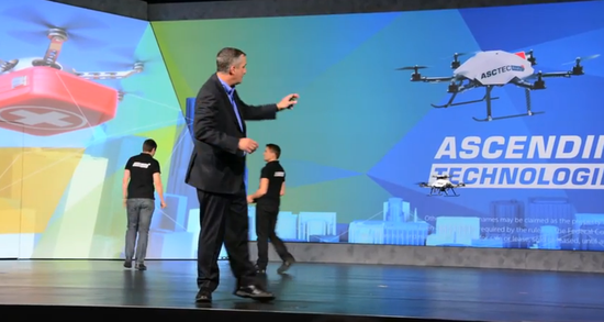 英特尔CEO科再奇(Brian Krzanich)在去年拉斯维加斯国际消费电子展(CES)的主题演讲中展示了来自Ascending Technologies的无人机。科再奇将于周二在今年的CES上发表主题演讲。