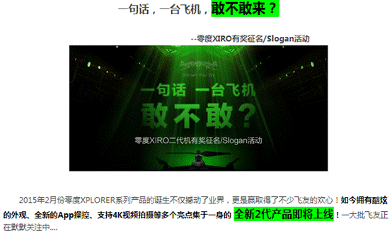 然而也有一些交叉领域的“碰撞”值得关注。从邀请函上来看,将会发布联合腾讯研发的新款XIRO系列无人机,零度在12月就开始进行Slogan征名活动,看来就是为了这款产品。根据网上的图片,该款无人机采用旋翼可折叠,内置摄像头的机身设计。具备图像识别的飞控功能,以及室内定位技术等。这些依然停留在前文所说的‘影像数据’平台范畴,而让MR.城堡感到眼前一亮的是零度和腾讯的合作。腾讯具备众多并且强大的数据端口,MR.城堡预计该款无人机产品将会具备与腾讯手机应用进行数据互联的功能。虽然无人机作为数据平台或者被控对象与手机APP协同使用早已是成熟技术,但这些技术仅仅将手机看做数据的“流动通道”:将控制信号传输给无人机,显示或者存储无人机采集的数据等。在这一过程中并没有产生新的数据类型,且单独手机的APP对于数据的处理能力非常有限。而腾讯作为国内的BAT龙头企业之一,具备众多移动设备数据端口与产品,可以通过无人机的数据采集能力产生更多的附加数据,如将实时影像数据转化为社交内容,或提取位置信息进行数据分析等等。同时也提供了更多的数据处理方式与更强大的数据处理能力,这是单个手机或者无人机厂商自己的APP难以实现的。