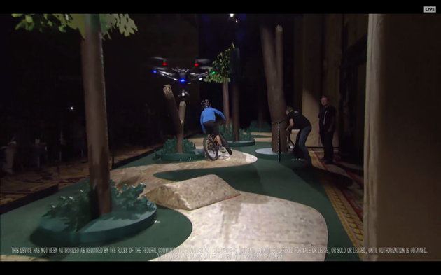 在主题演讲中,这架无人机可以在人造树林中始终跟踪自行车骑行者,还能自动避开下落的树枝,并实时拍摄视频。