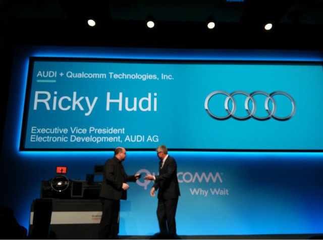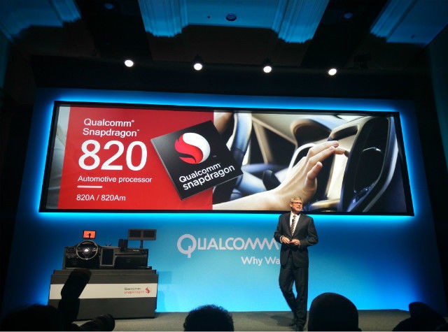 在发布会现场舞台上有一个带有巨大中控屏的汽车驾驶台,揭示了本次发布会将以汽车电子为主导方向。Qualcomm首席执行官史蒂夫·莫伦科夫登台演讲,他首先回顾了2015年高通的发展,高通在汽车智能、智慧城市、智能穿戴、网络通信、智能家庭、数据中心、医疗领域以及智能手机市场多方面助力产业发展和变革。对高通来说,在研发方面投入巨大,智能和连接能力是推动消费电子发展的核心,而这正是高通的强项。