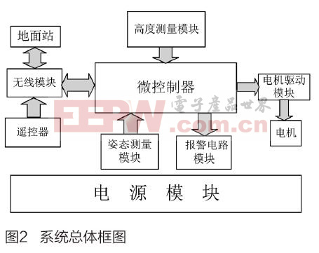 飞行控制系统分为地面和机载两部分,其在物理上是彼此单独的,在逻辑上是彼此相连的。地面部分又分为地面站部分和遥控器部分,这两部分相互独立。整个飞行控制系统由微控制器模块、无线模块、电机驱动模块、姿态测量模块、高度测量模块、报警电路模块、地面站和遥控器等部分组成。系统总体框图如图2所示。