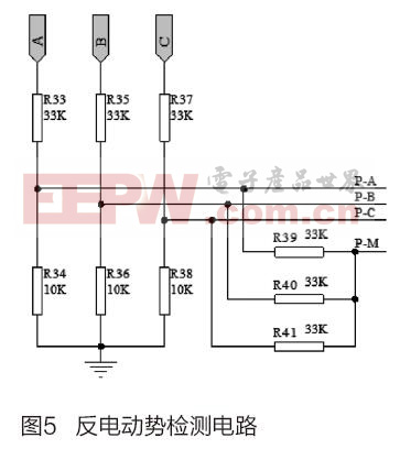 在换向的过程中,需要不停地检测转子的位置,通过转子产生的反电动势就可以知道转子的位置信息,通过分压衰减原理,检测电机三相反电动势电压相对中性点的电压,从而确定转子的位置。反电动势检测电路如图5所示。