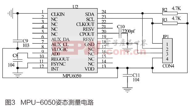 四旋翼飞行器受电机振动和外界干扰影响较大,精确数学模型建立较难,且其载重有限,一般以惯性器件作为姿态测量装置,姿态测量部件是整个硬件系统的重要部分。本设计综合考虑硬件设计原则,采用MPU-6050作为飞行器的姿态传感器。MPU-6050通过IIC协议接口进行通讯,只需要将MPU-6050的SDA数据线和SCL时钟线与STM32通用I/O口相连接,其电路如图3所示。为了稳定输出,避免空闲总线开漏,利用R2与R3作为SDA和SCL的上拉电阻,提高总线的负载能力。电路中C9为数字供电电压滤波电容,C8为校准滤波电容,C10为电荷泵电容,C11为供电电压滤波电容。