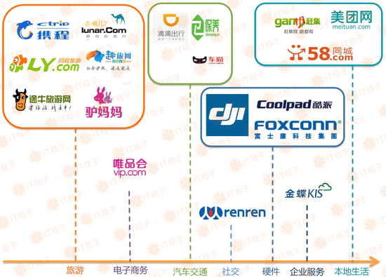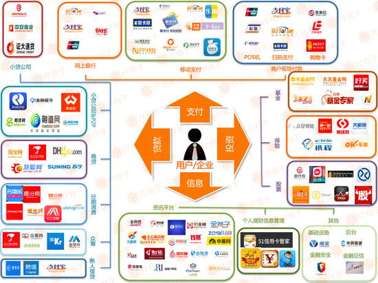 上图中列出了互联网金融的主要细分领域,在这些领域中,垂直行业的公司由于自身的属性,相对更专注于消费金融和供应链金融领域的开拓,保险(尤其旅游险和车险)、分期消费、商贷是这些公司涉及频次最高的金融产品,布局比较早的公司也会涉及理财、基金等其他产品,支付领域还是更多地支付宝、财付通(微信支付)这样的大公司产品占据主要市场份额。IT桔子列举了一些其他领域涉及互联网金融的案例,看看它们是如何围绕流量和场景进行布局的: