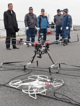 此外,演练还设想了停泊在终点附近东京湾的船只上飞起一架可疑无人机,由警卫船和巡逻船对无人机操作者发出禁飞警告。防爆队员让拦截型无人机飞向盘旋的可疑无人机,使用机身上拖挂的长约3米网兜将其捕获,并送至安全场所。