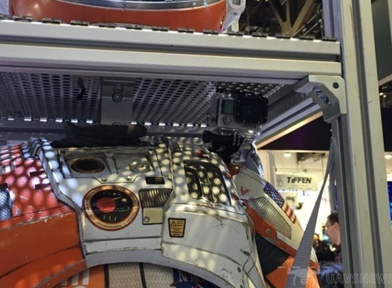 导演Ridley Scott 在电影中的动作镜头是用GoPro的摄像机录制的,他说GoPro的辨识度很高,是他想要的感觉。GoPro显然很乐意去提供产品。事实上,在电影拍摄期间,GoPro相机是真的在使用,去利用镜头捕捉相关画面。GoPro方面所付出的也就仅仅是给制片方提供GoProHero的系列产品。 如图所示,影片中Matt Damon 穿着的太空服也被放置在展台现场,GoPro相机置于太空服的肩膀处。