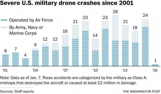 虽然美国空军军官曾公开抱怨过无人机人力和资源短缺这个问题,但他们却从未对外谈到过无人机坠毁这个问题,而这却是无人机作战系统存在的一个长期漏洞,并且在去年大幅恶化。据悉,Reaper在2015年坠毁了10架,至少是此前任何一年的两倍。