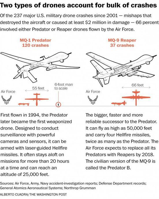 美军其他的无人机,如Predator,也面临着同样严重的问题。在去年,Predator发生了10起重大的无人机事故,这是继2011年美国向阿富汗增派部队并同时从伊拉克撤离地面部队之后发生无人机事故最多的一年。