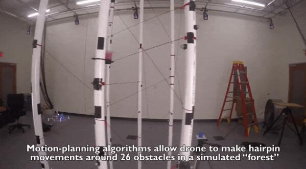 麻省理工大学研究人员借助一种先进的算法,让一款四翼无人机在一个包含了26个密集障碍物“丛林”中安全穿梭。该算法能够让无人机寻找到丛林中的自由空间,然后将它们串联起来构建一种安全飞行路线。实验的结果就是:无人机能够无费力穿过丛林中的电线杆和线绳障碍物。