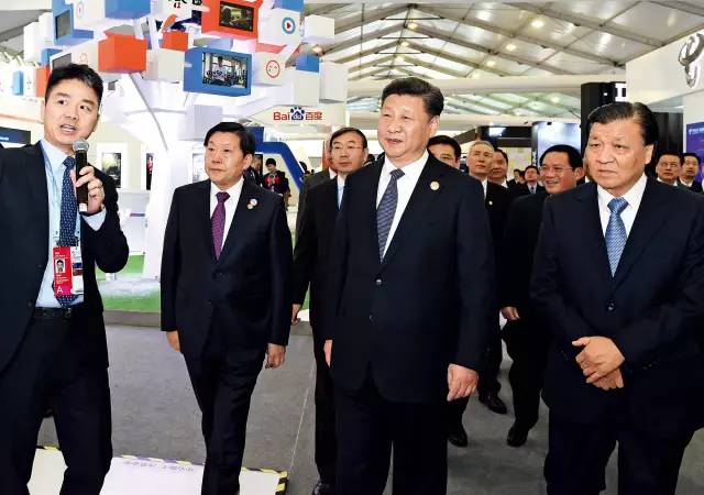 2015年12月16日,中共中央总书记、国家主席习近平在浙江省乌镇视察“互联网之光”博览会,中共中央政治局常委刘云山(右一)、国家互联网信息办公室主任鲁炜(左二)、浙江省省长李强(右二)陪同参观。 图/新华社记者 李学仁 摄