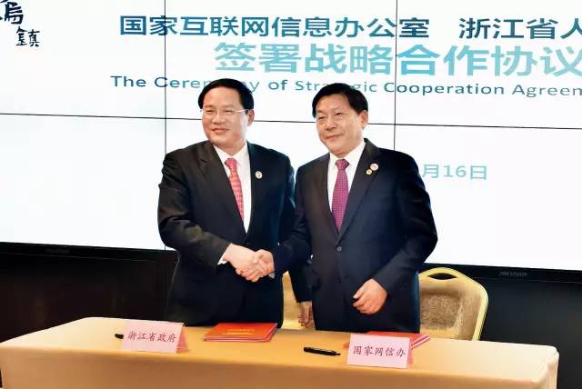 2015年12月16日,国家互联网信息办公室主任鲁炜(右)和浙江省省长李强(左)签署互联网创新发展战略合作框架协议。图/徐建荣 摄