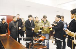 广州极飞电子科技有限公司负责人在向县领导介绍他们生产的无人机性能。
