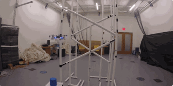 MIT的模拟环境中有通过绳子和PVC管搭建的26种不同类型障碍物,无人机可以在“模拟森林”中转圈或者以8字型轨迹飞行。