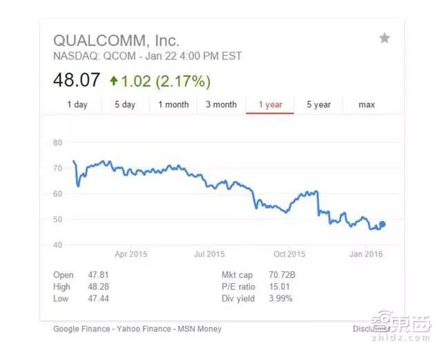 当然,备受损失的还有在资本战场的实力。相较一年前,高通的股价下跌了超过1/3,市值约为700亿美元——遥记2013年8月,其市值曾达到1138亿美元,并一度超越英特尔,进入全美最大的30家企业榜单之内。而如今,其市值仅为英特尔的一半。