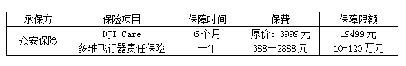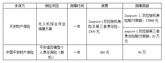 大疆创新联合众安保险,推出了针对悟 Inspire 1无人机的保险项目计划——DJI Care,也联合该保险公司,提供了其他的无人机险种,涵盖Phantom 系列、Inspire 1、筋斗云S900和筋斗云S1000四个型号。