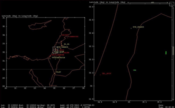 这是2009年6月5日截获的一架以色列无人机的位置信息,这个地图显示了无人机的地面轨迹。这个记录似乎是无人机静止的两秒钟。地图标志了三个位置:Tel Nof和Palmachim ,这两个地方都是无人机舰队的总部——以色列空军基地;Ein Shemer是以色列国防军进行无人机飞行训练的地方,也是反弹道导弹电池的贮存处。