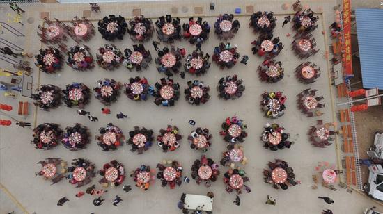 下午16点,随着第14个节目结束,观众准备退场,几十张大圆桌又搬上来——今年的坝坝宴又要上菜了。因为聚餐的村民太多,达到500多人,而厨房有点远,大家只好用床板上菜。烧白、梓潼片粉……一会儿的功夫,50张圆桌摆得满满的。下午16:35分,在喜庆的氛围中,大家共同举杯,预祝明年二洞村能有更大发展。
