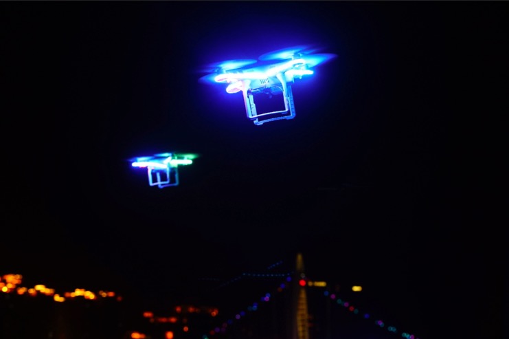 这是央视春节联欢晚会33年历史上第一次有民用无人机参与节目演出,此次表演前后仅用了15天时间筹备,整个表演共彩排6次。