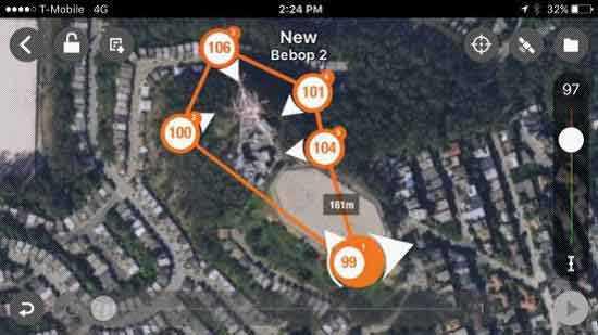 Flight Plan的设置非常简单,你只需点击卫星地图的某个区域,然后选择飞行高度和方向即可。不同于Wi-Fi连接,该功能会通过板载GPS来控制飞行,后者的连接也没有出现任何问题。不过Flight Plan所提供的地图并没有提供足够高的放大等级,因而无法提供更为精准的飞行路线制定,特别是在设定着陆点时。