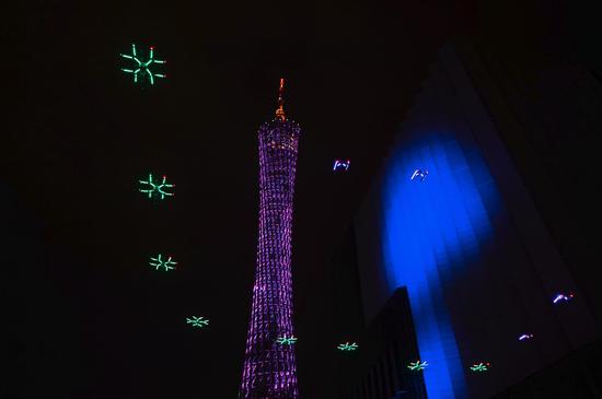 当晚10时许,春晚再次进入广州分会场时间,知名歌手孙楠登台献唱歌曲《冲向巅峰》。孙楠演唱的同时,多组装有LED灯的大疆各型号无人机伴随着音乐旋律缓缓升起,在空中组成表演队列,不断变换阵型,在观众的惊叹声中将整台晚会的气氛推向又一个高潮。