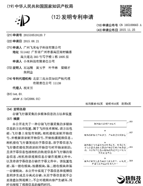 此外,国家知识产权局网站显示,小米科技有限责任公司和广州飞米电子科技有限公司在2015年5月~6月期间,联名申请了23个发明专利和4个实用新型专利。涉及的专利包括飞行器、操作控制方法及装置、螺旋桨结构、飞行器主体和脚架等。