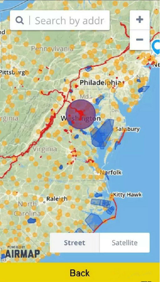 上滑可以看到目前的区域是否是禁飞区,红色,蓝色,橙色都是不能飞。