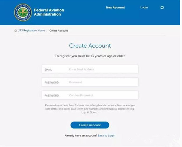 我们作为航拍兴趣爱好者的在这里注册:https://registermyuas.faa.gov/register首先申请个账号,邮箱,密码输入后,点Create Account。