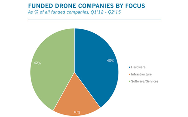 2015年8月,CB Insights发布的一项市场研究报告显示, 自2014年起,至今年8月,无人机公司共获得2.85亿美元的投资,其中最受资本青睐的6家公司分别为:大疆创新(获投7500万美元),3D Robotics (获投9900万美元),Airware(获投4020万美元),Skycatch(获投2140万美元),Xaircraft(获投2000万美元),CyPhy Works(获投1490万美元)。虽然在以上6家公司中,4家是硬件制造商,仅2家是软件或者服务提供商,但是报告称,获得投资的硬件和软件/服务公司数量基本持平,分别占总数的40%和42%。