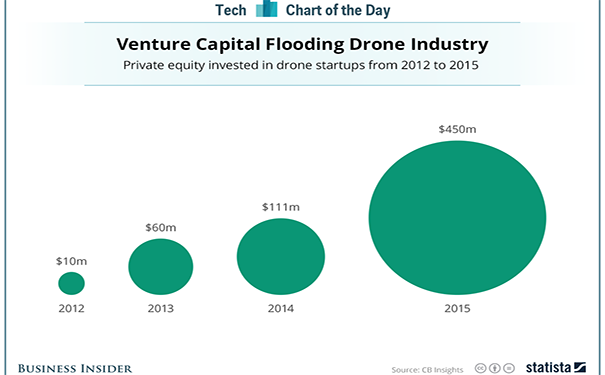 近日,德国数据分析公司Statista基于美国科技市场研究公司CBInsights发布的数据,绘制了一个无人机行业融资情况图表。图表显示,2012-2015年无人机领域的融资金额逐年递增。2015年,无人机领域新兴企业所获得风险投资金额达到2014年的4倍。