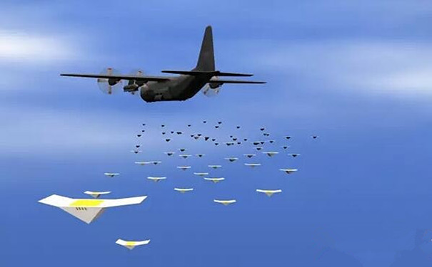 为了实现这项技术,2015年9月,美国国防部高级研究计划局(简称DARPA)推出了“Gremlins(小魔怪)”无人机计划。根据该计划,无人机机群将从大型飞机(比如轰炸机和运输机)、战机、或者小型固定翼平台上发射,且发射平台将置于敌方防御范围之外。无人机一旦完成任务,就会由一架C-130运输机回收并带回,并可能要为24小时之内的下一次作战做准备,理想状态下,可以反复部署20次。