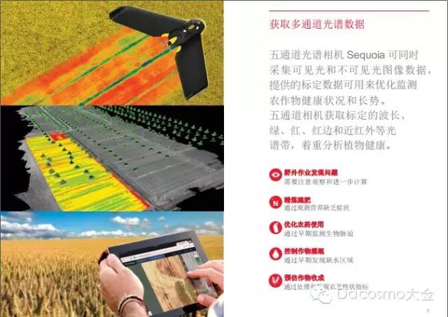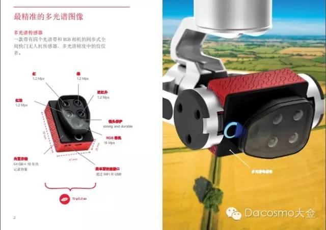 它通过四个高清晰、可见和不可见光谱带以及RGB影像,来获取农业相关图像信息。仅需一次飞行,农业专家、农业顾问和农民就可以获取所需的航空影像数据,用于生长期植物健康的分析和反馈。