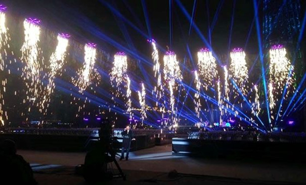当晚10时许,知名歌手孙楠登台献唱歌曲《冲向巅峰》。孙楠演唱的同时,多组装有LED灯的大疆各型号无人机伴随着音乐旋律缓缓升起,在空中组成表演队列,不断变换阵型。