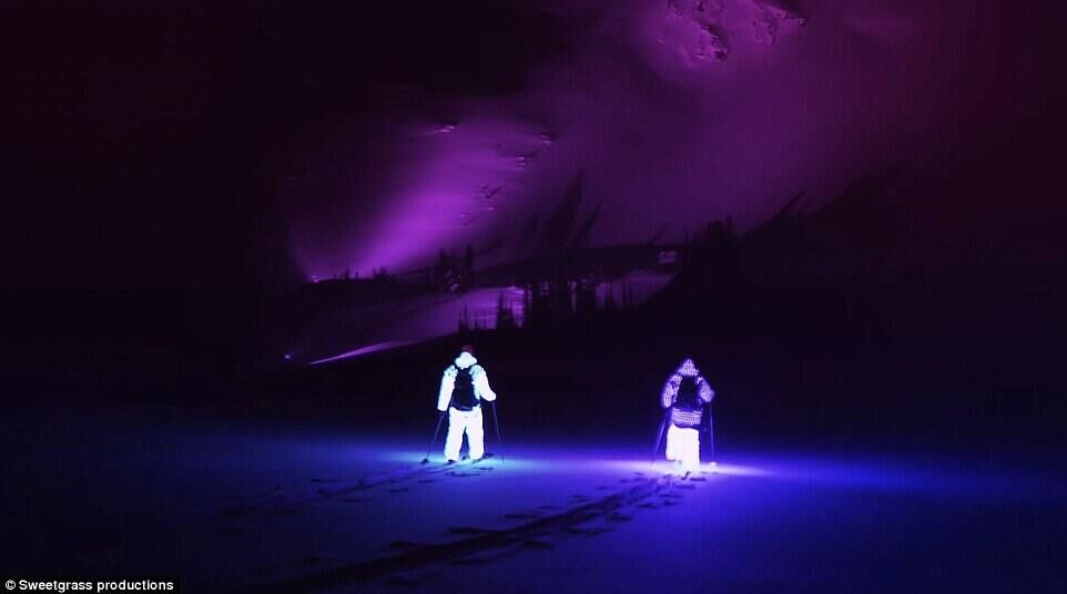 2、这个12分钟的电影由“Sweetgrass”创意团队摄于不列颠哥伦比亚与阿拉斯加的局部地区。滑雪服上的每块戈尔特斯布料都缝着数以千计的LED灯,这种布料是防水材质并且连接有糖果大小的电池。
