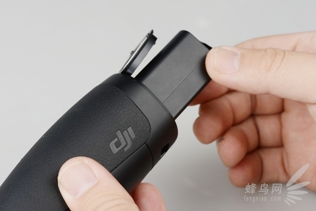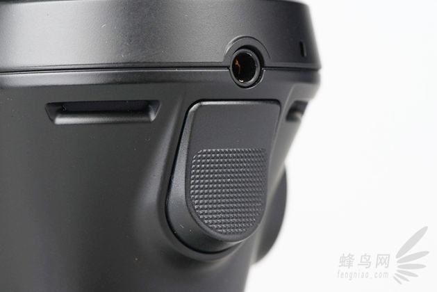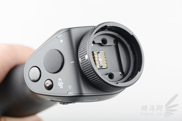 上方的圆孔是外接麦克风插孔,由于云台本身体积小,运行过程中也有一定的噪音,所以机载麦克风的录音效果不够理想。有了外接麦克风这类问题就可以迎刃而解了。但是在日常拍摄过程当中,OSMO的录音效果也可以接受。现在OSMO已经标配便携式麦克风,新老用户都可以获得一款免费麦克风,可以获得更好的使用体验。