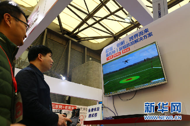 2月24日,现场观众在易瓦特展台前体验模拟器飞行。新华网梁鸿儒 摄