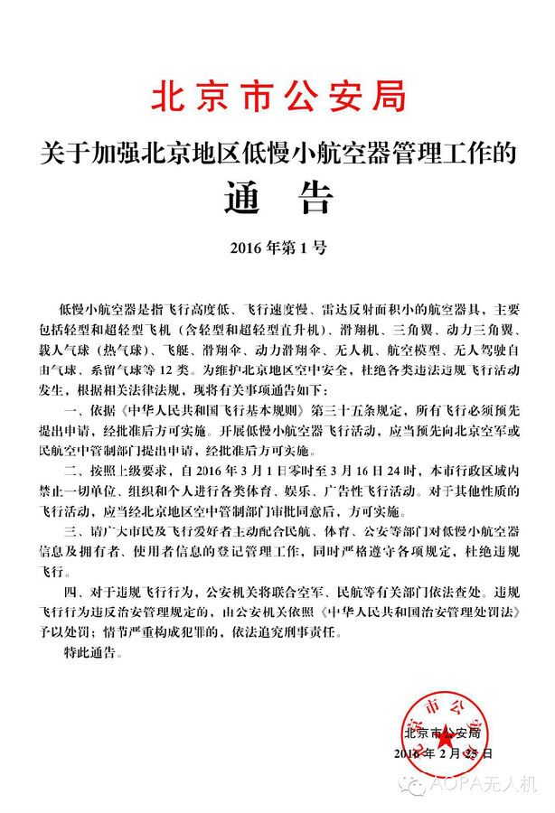 “两会”将于3月3日在京开幕,为了全面保障两会安全,北京市公安局发布了《关于加强北京地区低慢小航空器管理工作的通告》。通告指出,在3月1日零时至3月16日24时,包括无人机在内的12类低慢小航空器在北京市行政区域内禁止飞行。
