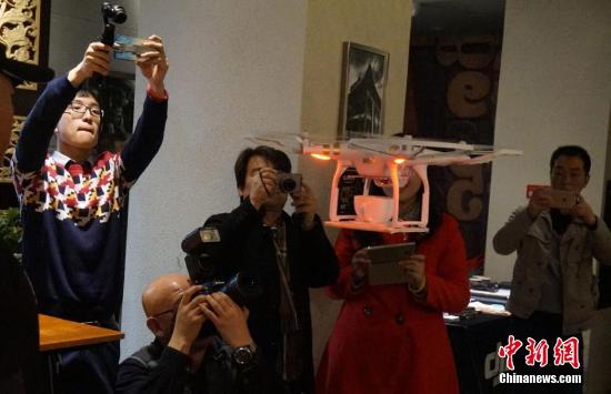 2月27日,兰州一咖啡馆用无人机给顾客送咖啡吸引眼球。 杨艳敏摄