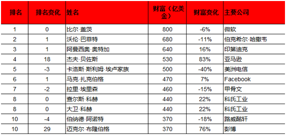 60岁的比尔•盖茨以800亿美元蝉联世界首富。85岁的沃伦• 巴菲特财富减少了11%,以680亿美元排在第二位。Zara创始人阿曼西奥•奥特加640亿美元排名第三。31岁的马克•扎克伯格470亿美元位列第6,成为前10名中的最年轻上榜富豪。