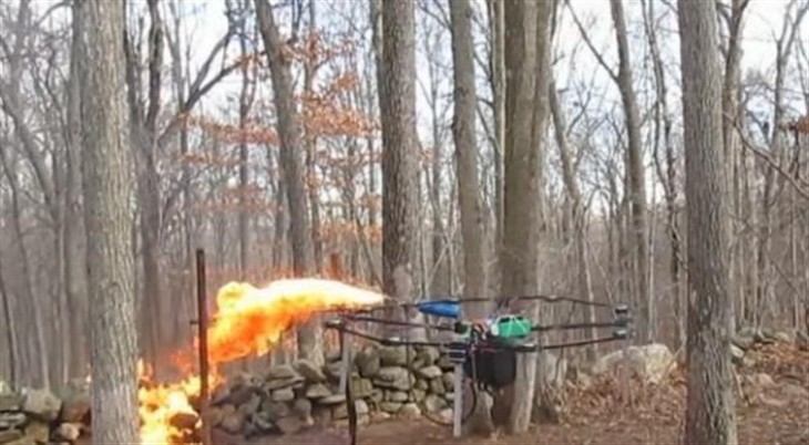 除了无人机装载半自动化手枪的案例,也有无人机烤鸡案例,在无人机烤鸡案例中,无人机安装上了喷火装置来喷火。(画面见下图)