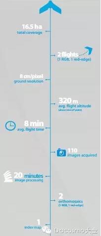 “我们了解到制定飞行规划的艺术在于你要求的精度(地面精度,在eMotion软件中设置,以厘米/像素来计量)与你能飞高度之间的平衡。”Plate先生说,“你飞得越高,拍摄的范围越光,获得的照片越少,虽然后期信息处理的速度会越快,但是精度就越低”