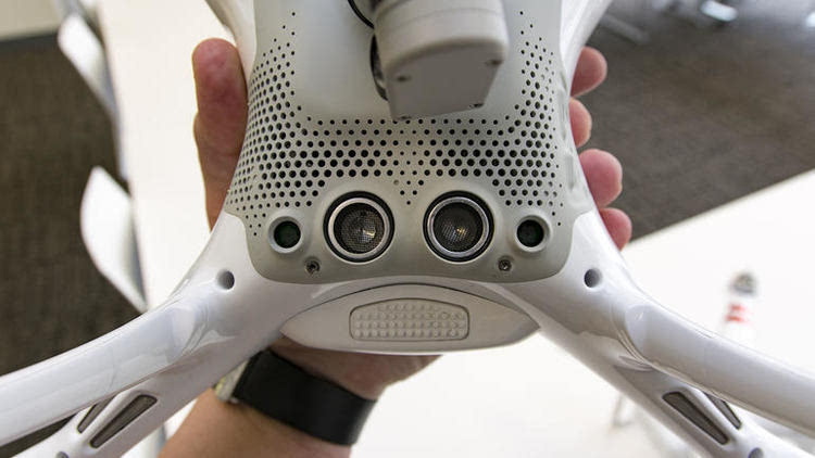 传感器遍布机身,在下方也有安装,使得精灵 4 在一般速度飞行时能够提前识别 15 米以内、70 厘米以外的大小障碍物,从而提前减速、转向绕开。
