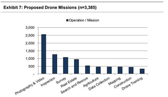 在美国,非娱乐型无人机的运营商想要进行无人机作业,必须获得美国联邦航空管理局(FAA)基于第333节规定授予的豁免权。截止到2016年2月 12日,共有3385项申请获得了豁免权,大部分申请主要是针对航空摄影,也有少数针对农业、飞手培训等领域。下图详细列出了3385项申请的具体分配情 况。