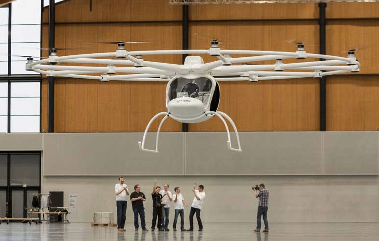 2015年还是这帮人,把“死亡陷阱”进行了符合广电胃口的调整,制造了一架更漂亮的载人多旋翼。而且重心也更低,稳定性也会更好一些。资料称:Volocopter 有 18 个旋翼,可以像直升机一样垂直起降。有两个座位,使用电池供电,飞行时间可以达到 20-30 分钟。